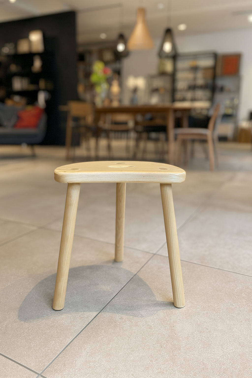 Ce tabouret est une version revisitée du vacher utilisé autrefois dans les fermes.